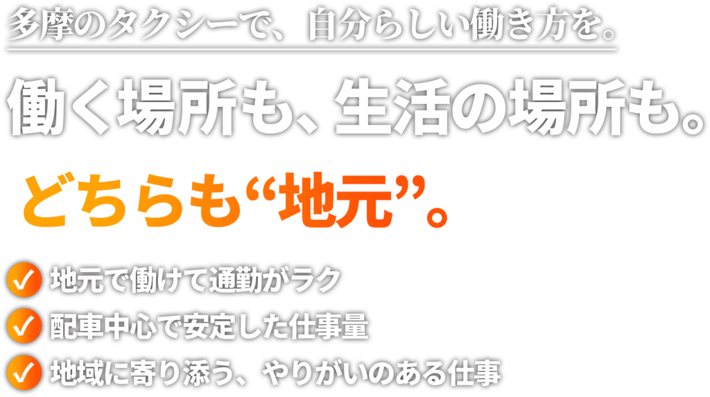 多摩地区のタクシー乗務は、職場が自宅の近くという方も少なくありません。23区のように長時間の通勤や満員電車に悩まされることがなく、出勤・退勤の負担が大きく減ります。