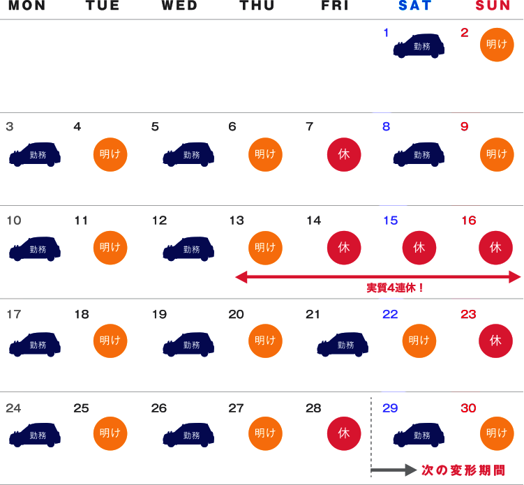 タクシードライバーのスタンダードな働き方である「隔日勤務」では、1回の勤務で昼夜を通して乗務し、翌日はしっかり休む働き方です。出勤は月12回前後が一般的で、まとめて働いてしっかり休むリズムをつくれます。
